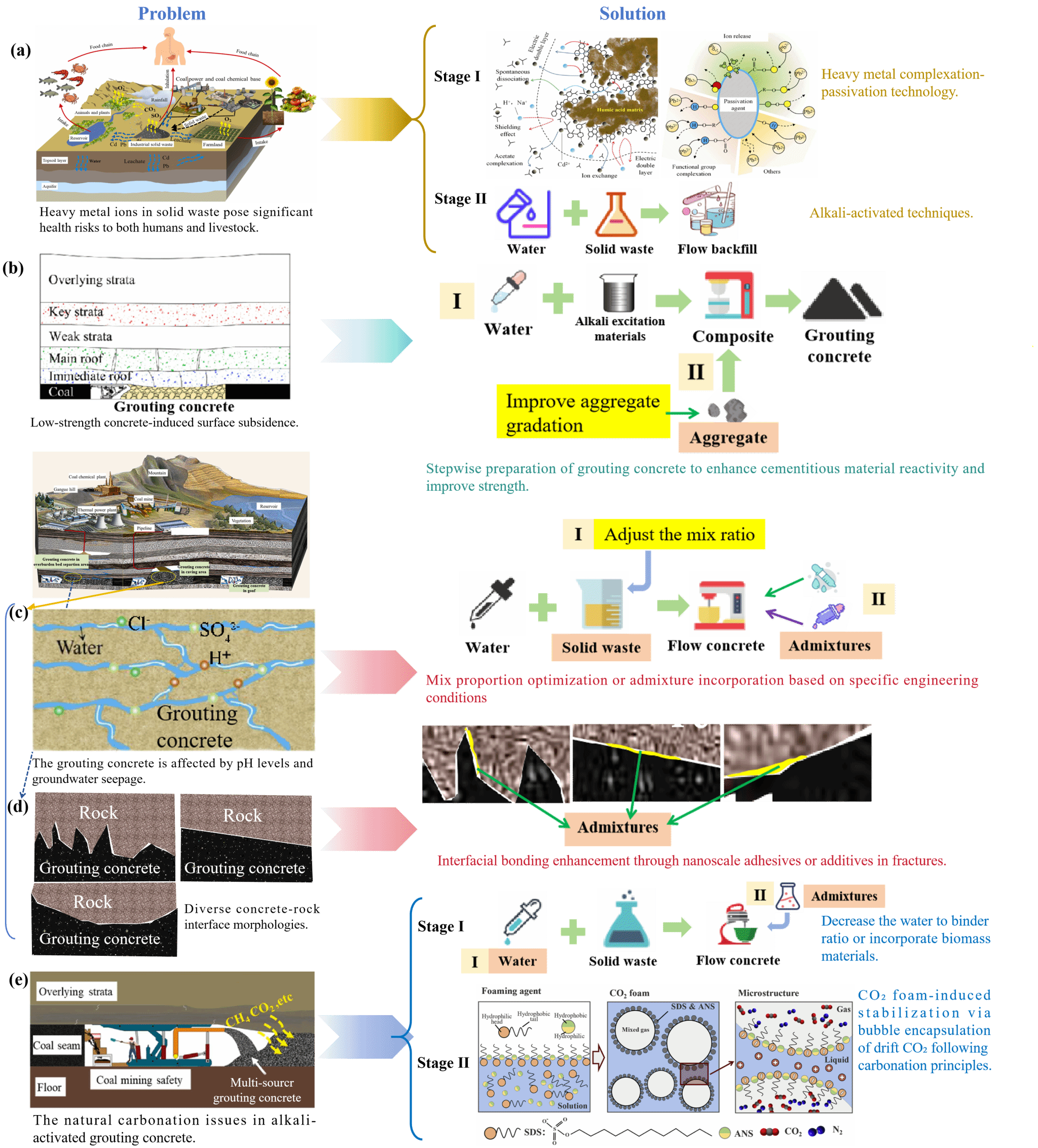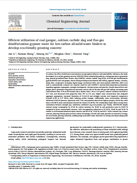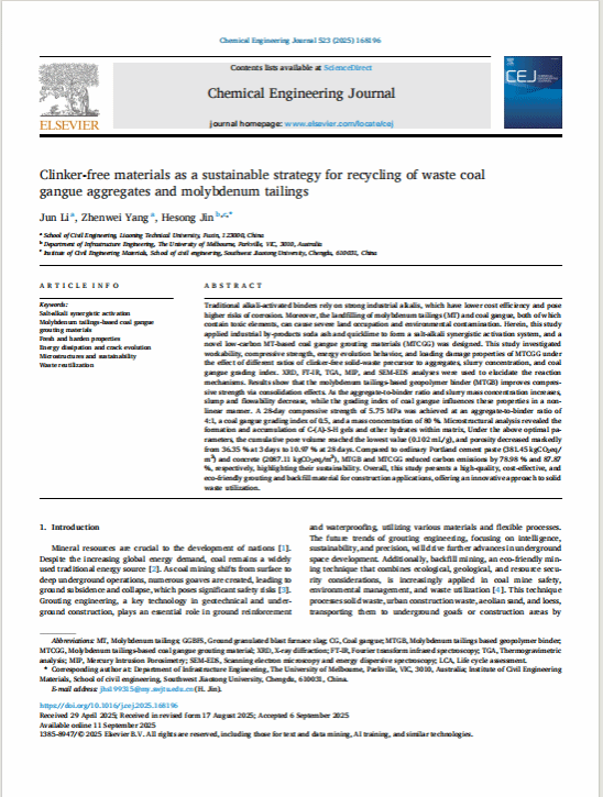首篇论文《Clinker-free materials as a sustainable strategy for recycling of waste coal gangue aggregates and molybdenum tailings》聚焦煤矸石、钼尾矿两类工业固废的资源化困境,创新性提出无熟料材料制备技术路径。该研究突破传统固废利用中“掺量低、附加值低”的瓶颈,为固废的高效回收提供了可持续解决方案。另一篇论文《Efficient utilization of coal gangue, calcium carbide slag and flue-gas desulfurization gypsum waste for low-carbon all-solid-waste binders to develop eco-friendly grouting concrete》以煤矸石、电石渣、脱硫石膏为核心原料,成功研发出全固废基低碳胶凝材料,并应用于环保型灌浆混凝土制备。该技术大幅降低对传统硅酸盐水泥的依赖,显著减少建材生产过程碳排放,同时实现多种固废的协同高效利用。