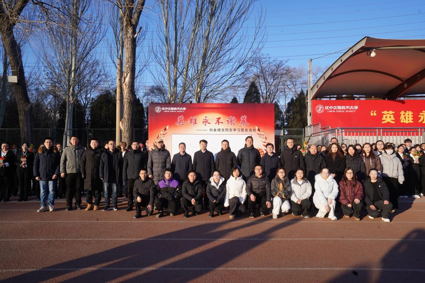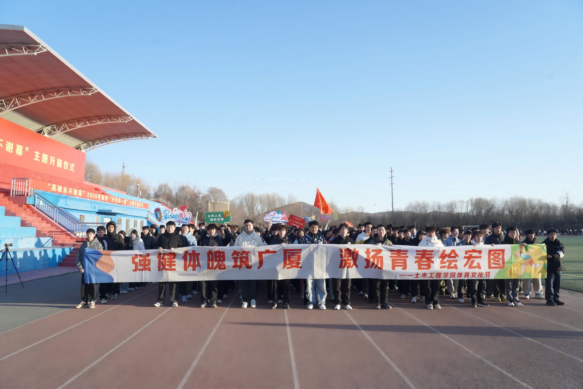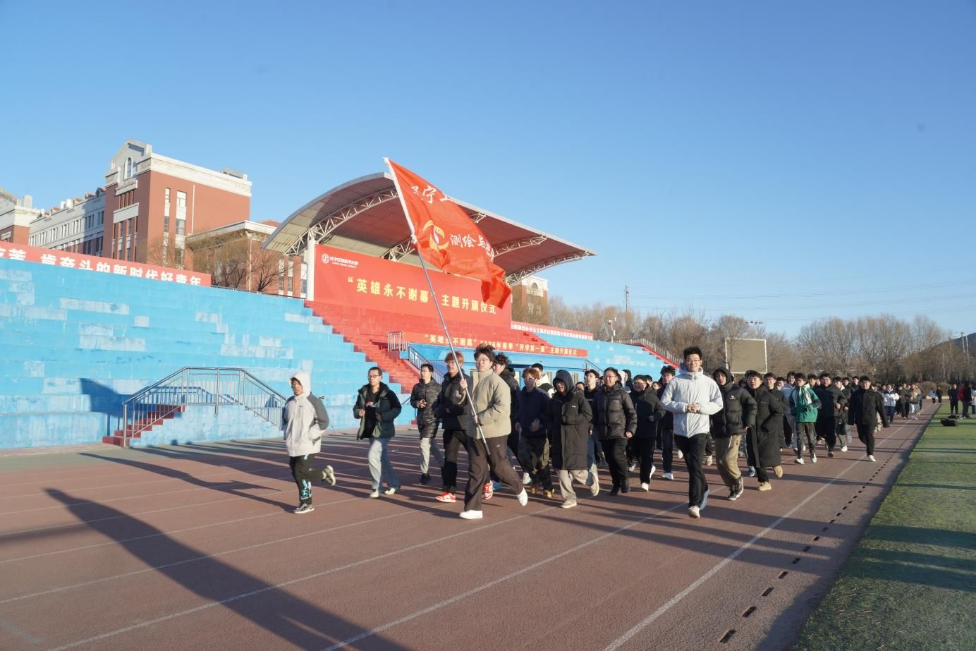 3月9日清晨,学校在两校区三校园体育场举行“英雄永不谢幕”2026年春季“开学第一课”主题升旗仪式。校领导、党委常委、党群行政职能部门负责人,各学院辅导员、班主任及学生参加了升旗仪式。
