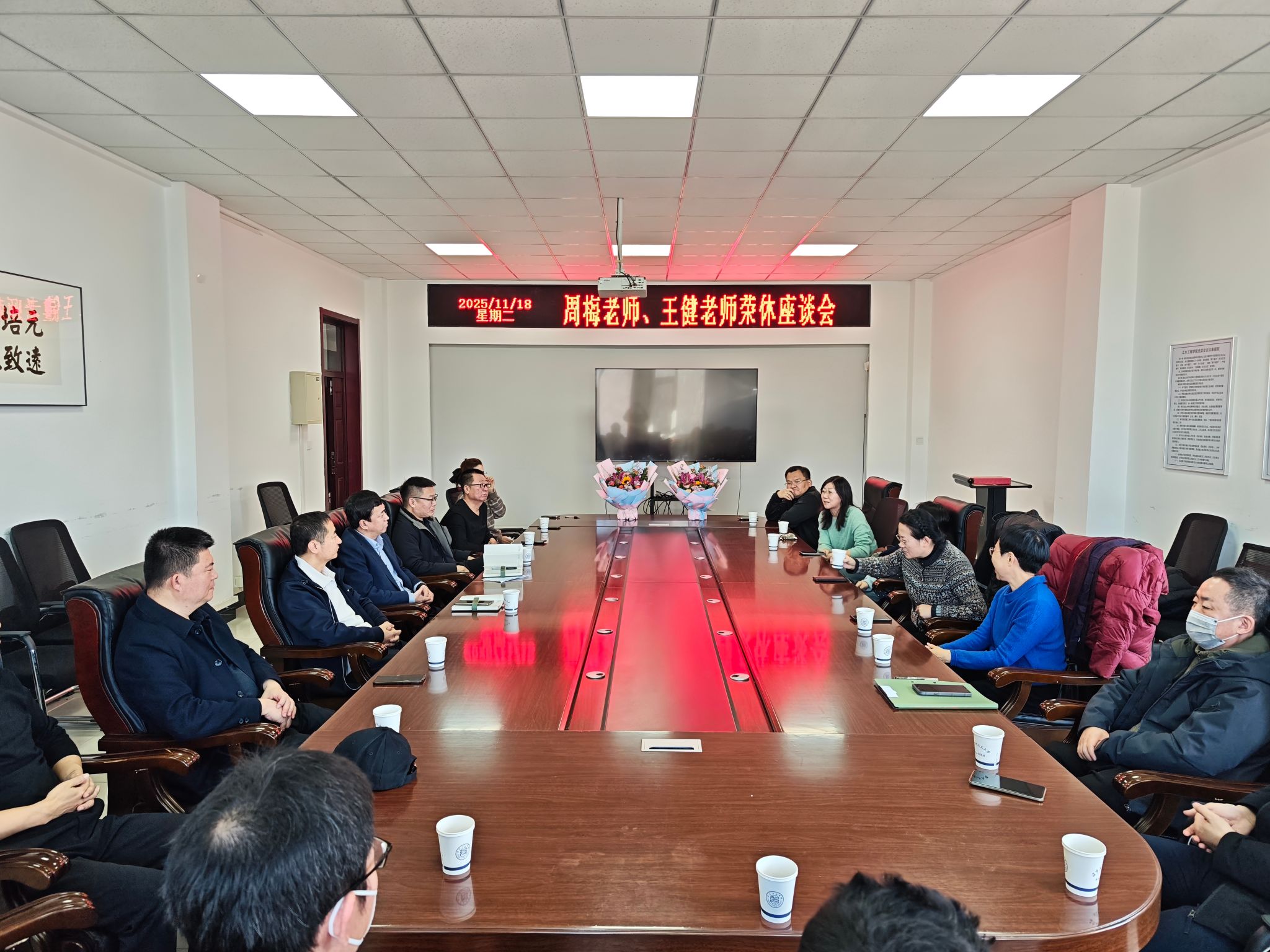 11月18日,土木工程学院建筑工程系举办荣休座谈会,隆重致敬周梅老师和王健老师光荣退休。学院领导、建筑工程系与智能建造系的老师们齐聚一堂,共同回顾两位老师的光辉教学生涯,传承他们的敬业精神与专业智慧。