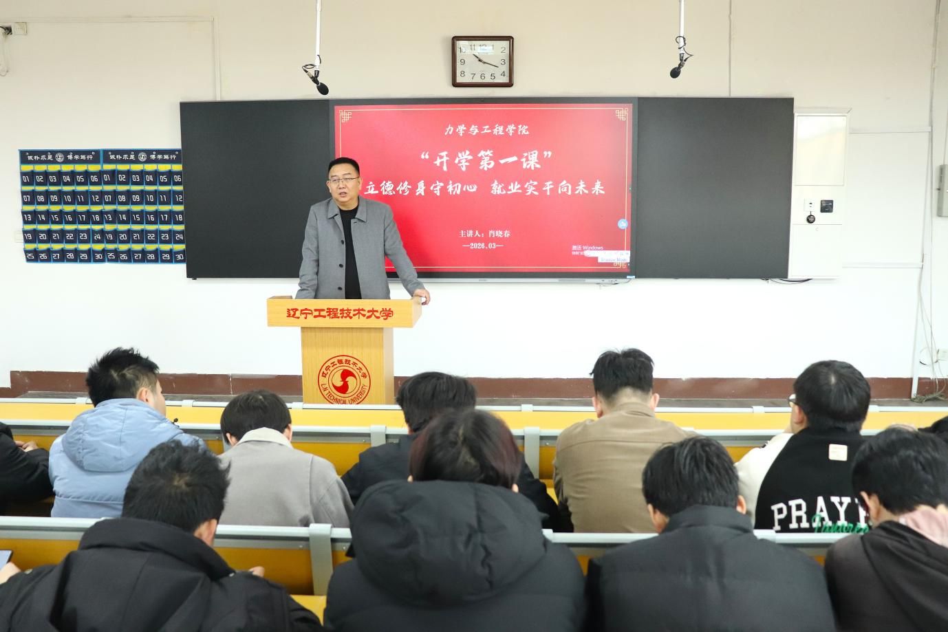 为扎实推进2026届毕业生就业工作,引导毕业生树立正确就业观,3月20日,力学与工程学院开展“就业第一课”活动,学院院长肖晓春以“立德修身守初心,就业实干向未来”为题作专题授课,2026届全体毕业生参加本次活动。