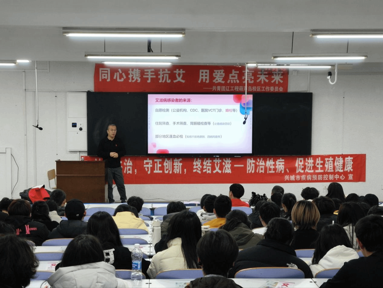 在第38个“世界艾滋病日”来临之际,龙湾校园内举办了一场以“同心携手抗艾,用爱点亮未来”为主题的艾滋病防治专题讲座。此次活动由校区团工委、兴城市疾病预防控制中心联合主办,爱心志愿者联盟承办。兴城市疾病预防控制中心相关专家、爱心志愿者联盟指导教师及百余名学生共同参与了此次活动。讲座内容涵盖了艾滋病的基本知识、传播途径、预防措施等核心内容,通过专家宣讲、互动问答等形式为师生呈现了一场兼具科学性与实用性的健康科普盛宴。