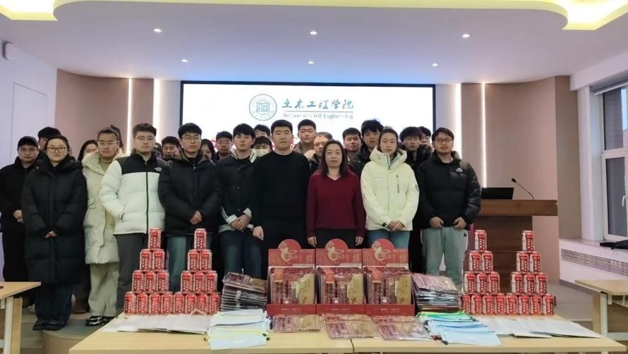 随后,两位老师代表学院为学子们送上真挚的考研祝福。学院精心筹备的考研礼包中,既有契合考场需求的文具套装,承载着“金榜题名”的美好寓意;也有定制祝福语可乐垒成的层叠造型,每一句“心有所期,定有所成”都凝结着对学子未来的殷切期待;此外还有手机袋和进入考场用的透明物品手拎袋等贴心物品,于细微之处尽显学院的人文关怀。
